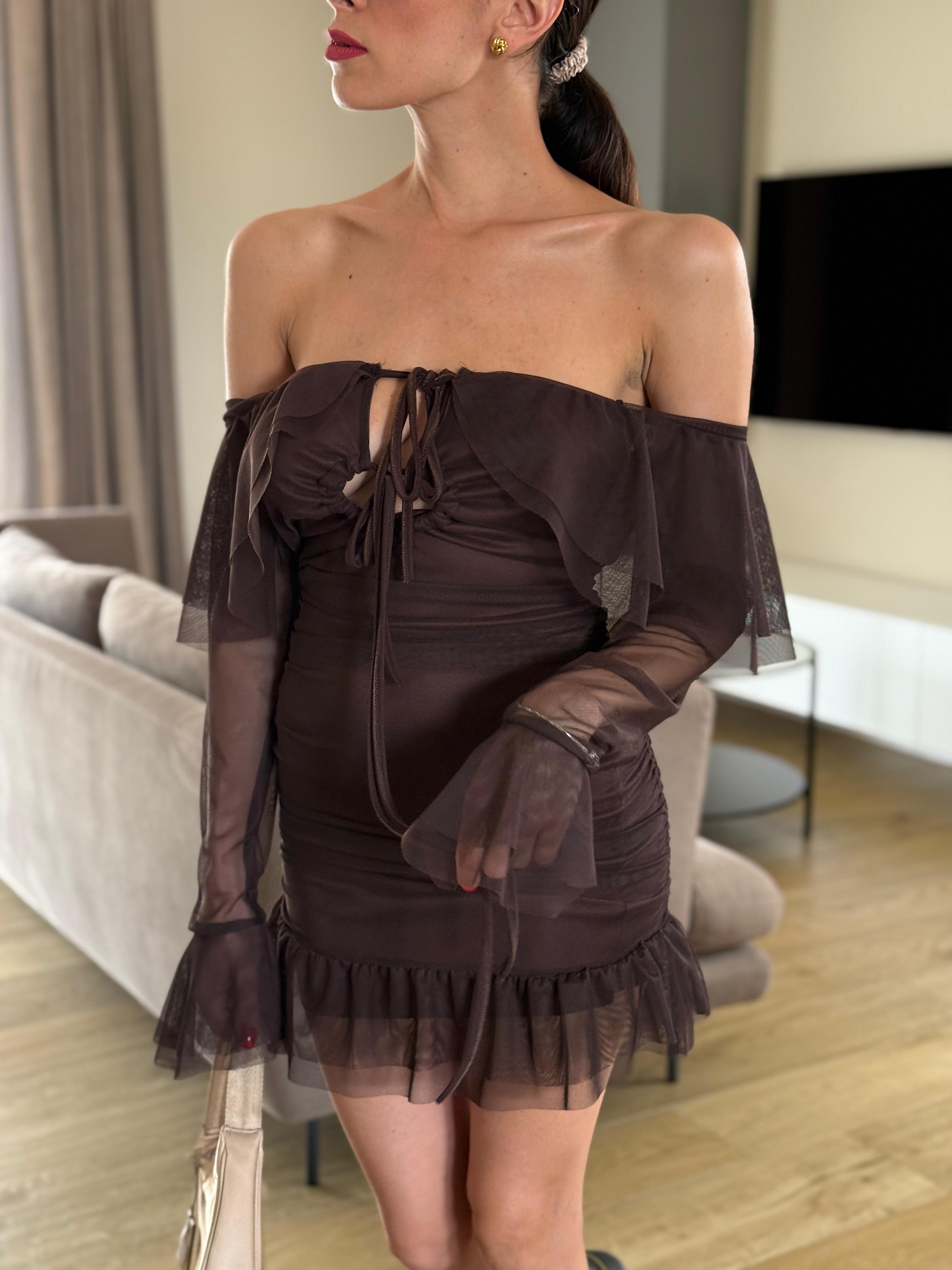 The Iole dress, featuring off-the-shoulder styling, exudes refined elegance and femininity. This design flatters the silhouette, accentuating the décolleté and providing a sense of lightness and freedom of movement, ideal for special occasions or summer events. Crafted from select materials, it combines style and comfort for a sophisticated look without sacrificing practicality.