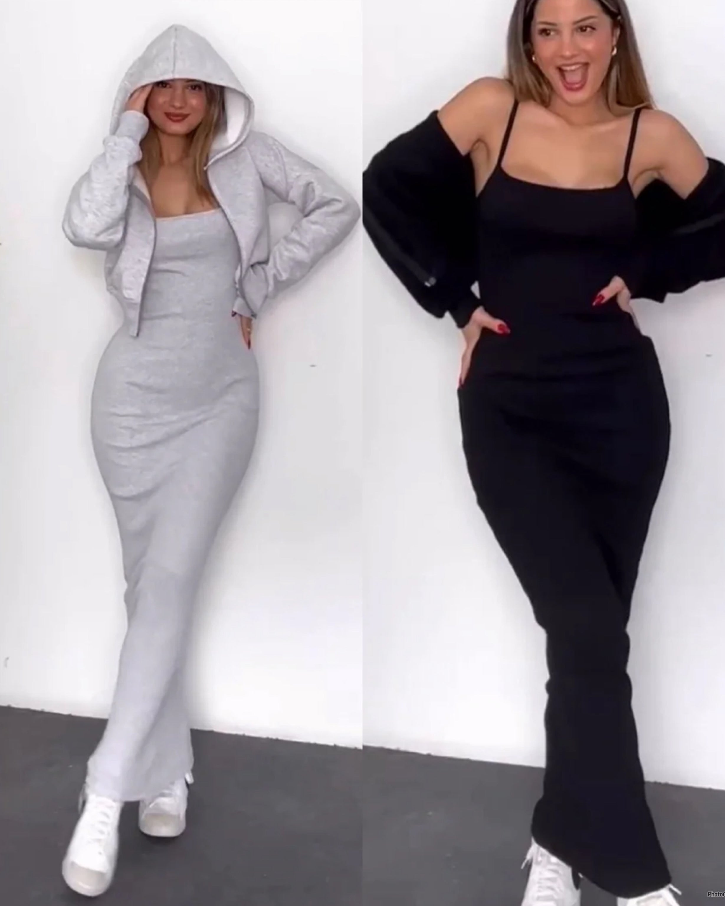 Complete zip-up sweatshirt plus dress with adjustable straps in various colors available