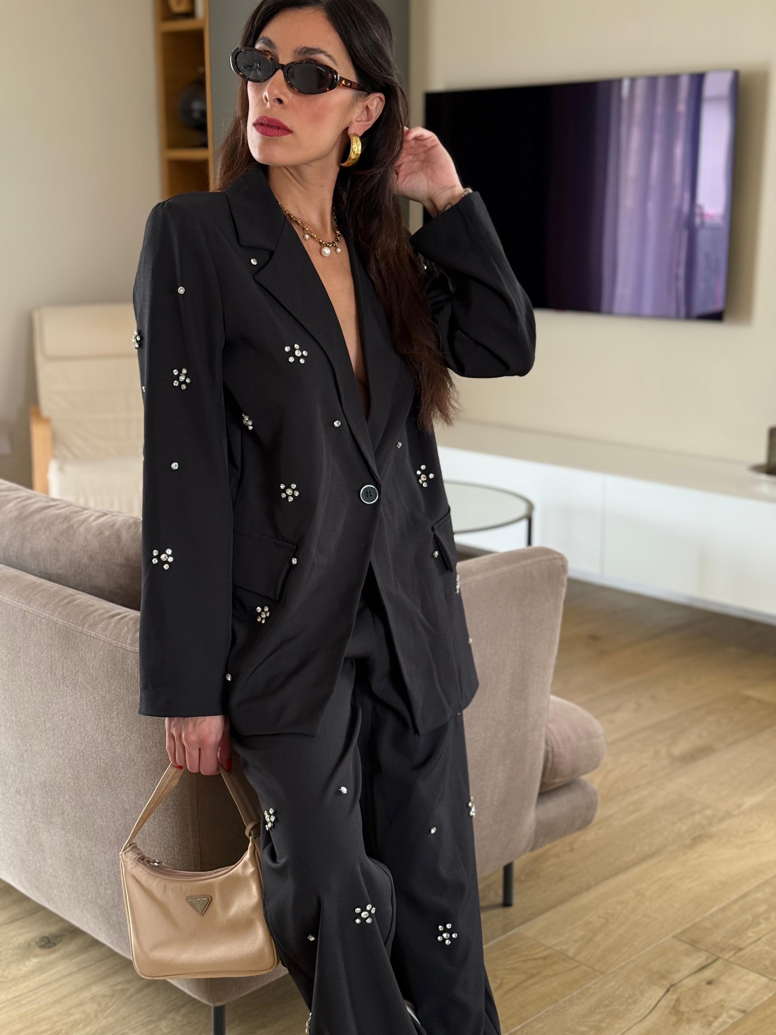 The Silvia rhinestone suit combines elegance and sophistication, perfect for those seeking a sophisticated look with a touch of sparkle. The rhinestone details add charm without overdoing it, enhancing the silhouette with style. Ideal for formal occasions or evening events, this suit strikes a balance between understated glamour and professionalism.