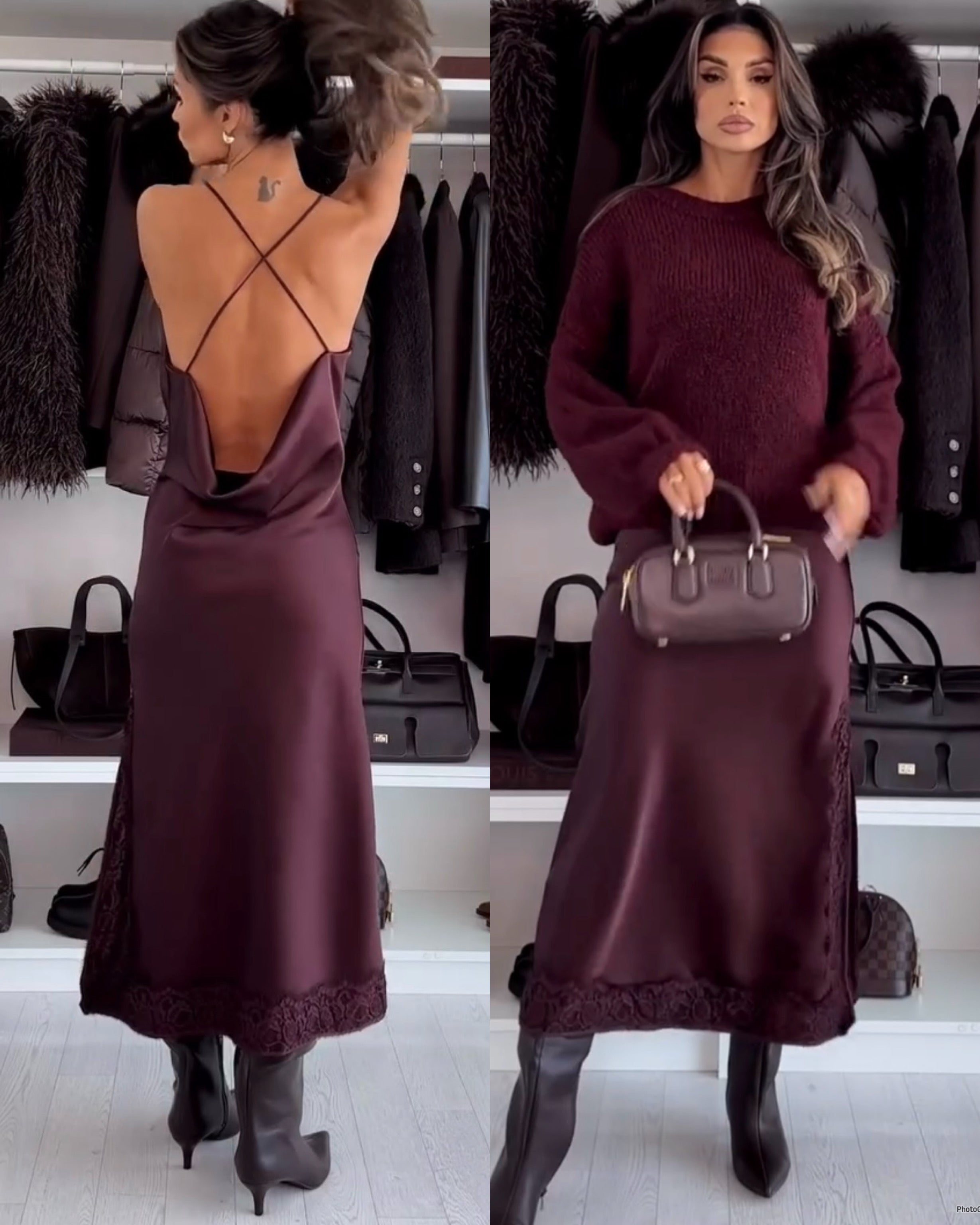Completo due pezzi abito in raso con pizzo e scollo sulla schiena più maglia in lana tutto vari colori disponibili