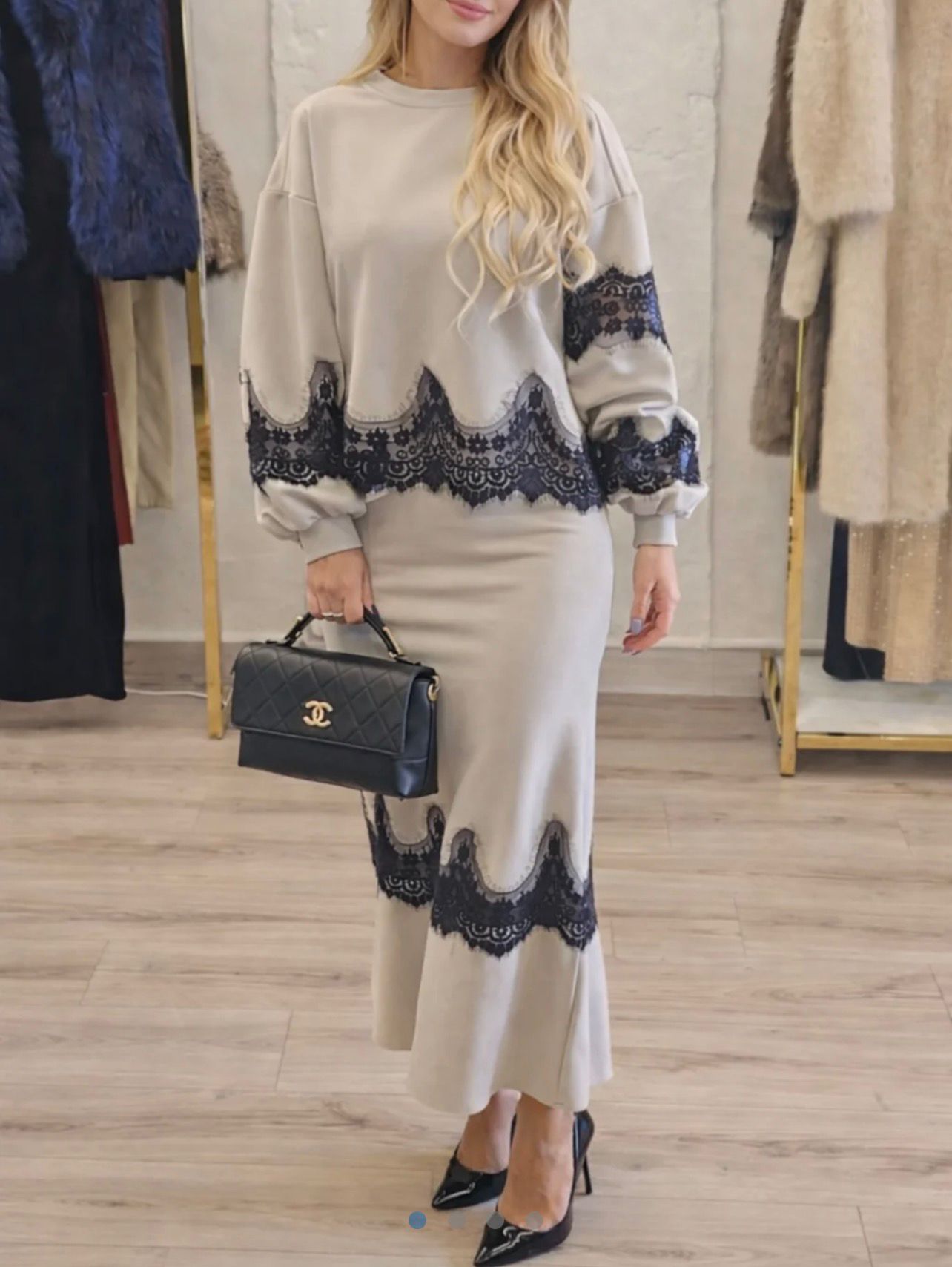 Il Set Olimpia consiste in un elegante abbinamento di due pezzi, composto da una gonna e una maglia, entrambi adornati con raffinati riporti in pizzo. Questo set offre una combinazione di comfort e stile, ideale per occasioni formali e informali, garantendo una vestibilità che valorizza la silhouette.